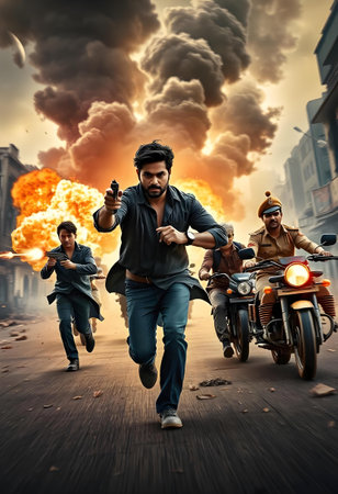 Action (War) movie concept. Military fighting silhouettes in destroyed city. Night scene. Selective focus