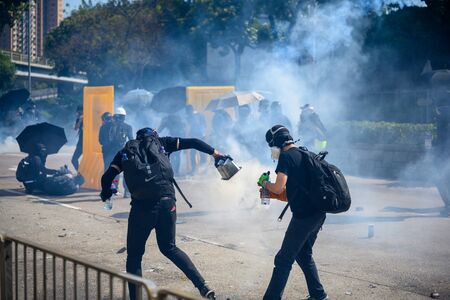 Bangkok, THAILAND - August 13, 2021: Riot police shoot tear gas and rubber bullets crackdown after protesters try to pass barrier to 1st Infantry Regiment for protest about failed covid-19 management.