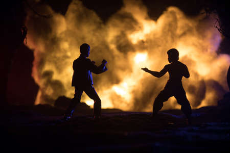 Karate athletes night fighting scene at burning forest. Character karate. Posing figure artwork decoration. Sport concept. Decorated foggy background with light. Selective focus