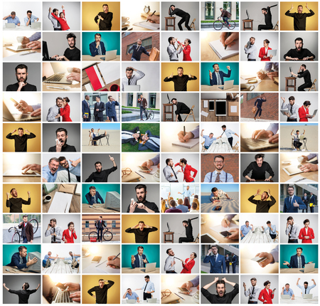 The collage from images of business man at office with different emotions