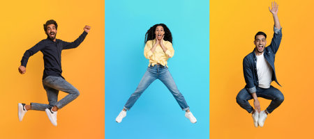 Celebrating diversity with joyful people jumping against vibrant backgrounds