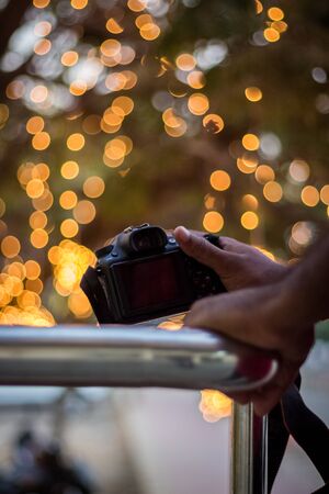 Professional photographer with camera on blurred bokeh background, closeup