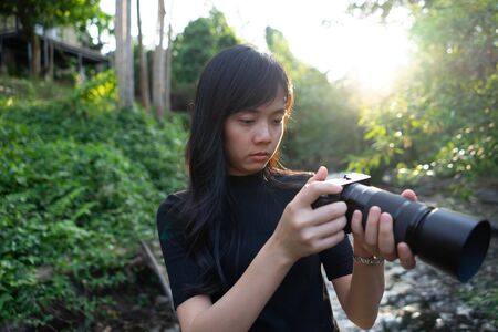 Asian woman photographer in nature. Taking pictures right side