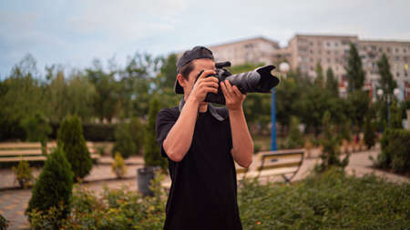 Photographer photographing outdoors. Shooting in urban city environment