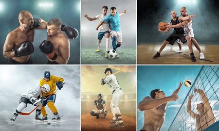 Collage of professional sport athletes. Baseball, basketball, beach volleyball, soccer, football, ice hockey, boxing.