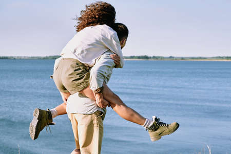 Young cheerful and affectionate woman sitting on back of her husband or boyfriend while both enjoying time by seaside on summer day