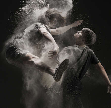 Creative dancers jumping in studio with powder