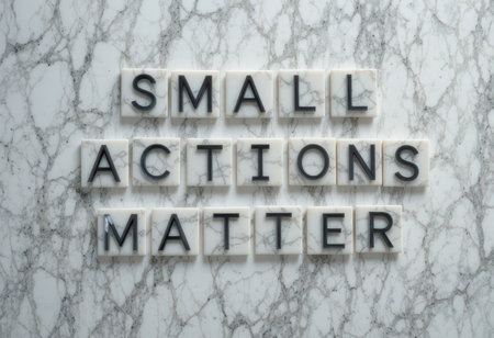 A visually striking arrangement of tiles with the phrase Small Actions Matter on a marble background, emphasizing the importance of making positive changes in life.