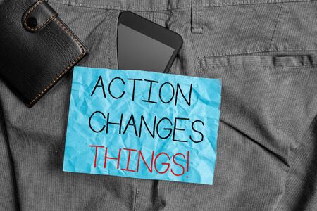 Text sign showing Action Changes Things. Business photo text start doing something against problem resolve or achieve it Smartphone device inside trousers front pocket with wallet and note paper