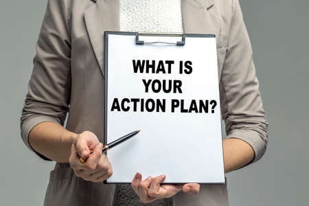 Business woman holding clipboard with the text: What Is Your Action Plan. Business concept.