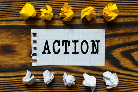 Business and finance concept. On a wooden board lie crumpled leaves of paper and a sheet from a notebook on which it is written - ACTION