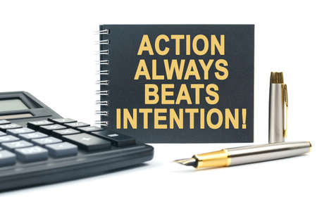Business and finance. On a white background, there is a calculator, a pen and a black notebook with the inscription -ACTION ALWAYS BEATS INTENTION
