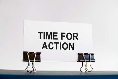 A white card with time for action text stands on paper clips on a desk against the light blue background. Unfocused.