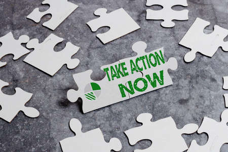 Conceptual caption Take Action Now. Word Written on do something official or concerted achieve aim with problem Building An Unfinished White Jigsaw Pattern Puzzle With Missing Last Piece