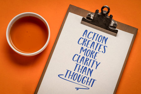 action creates more clarity than thought - inspirational reminder on a clipboard, productivity and personal development concept