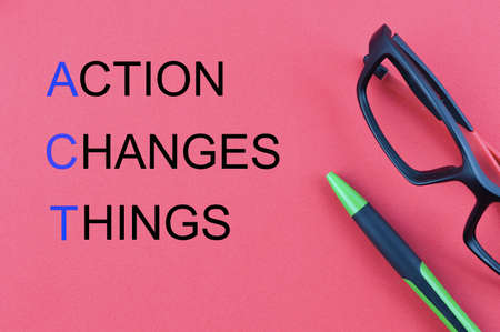 Pen and eyeglasses over red background written with ACTION CHANGES THINGS.