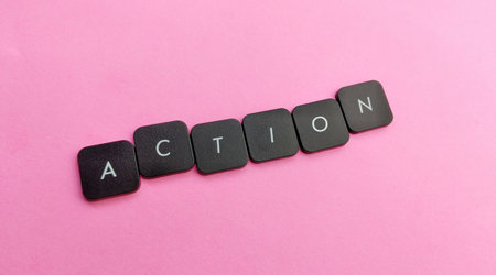 The word Action spelled out in black plastic buttons on a pink background