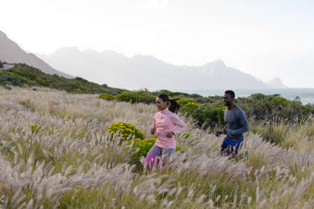 Fit african american couple in sportswear running through tall grass. healthy lifestyle, exercising in nature.