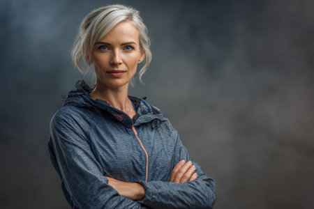 Full length portrait of female sports coach standing confidently with arms crossed against a textured backdrop