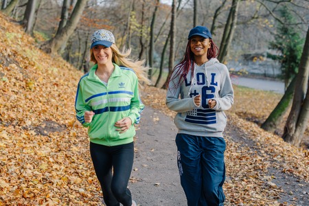 Two sports women running in autumn park. Blonde and african girls. Yellow leaves. Happy day