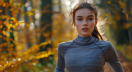 A focused young woman jogs along a river in a vibrant urban landscape. She wears a blue athletic shirt, embodying health and motivation on a cool day.