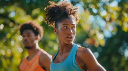 Two people running in a park, one wearing a blue tank top. The woman is looking ahead, while the man is behind her