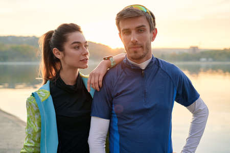 Sport motivation and healthy fitness lifestyle. Young couple of runners resting during outdoor morning workout.