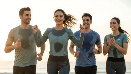 Three friends, two women and one man, share a moment of laughter while jogging in the golden glow of sunset. Their vibrant energy and genuine smiles capture the essence of friendship and the joy of staying active together.