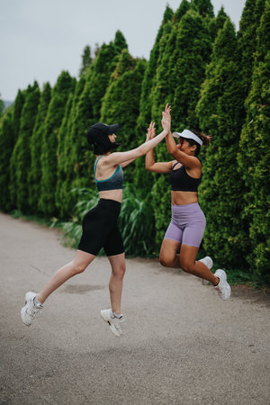 Two women celebrate with a high-five during an outdoor workout in athletic gear