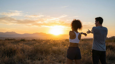 Rear view of a fit man and woman in sportswear warming up and stretching their arms while watching the sun set over a scenic mountain landscape.