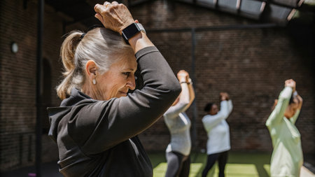 A senior woman attending a group aerobics class adjusting her wearable that vibrates to signal its time to hydrate while others follow her lead in staying refreshed..