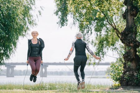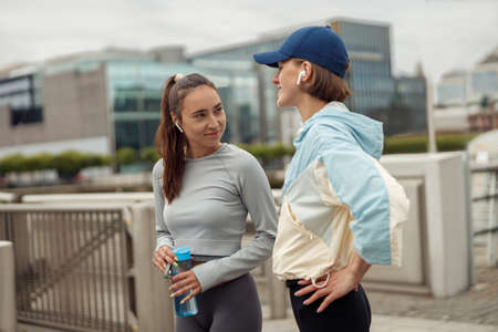 Active friends exercising on embankment. Women in sportive clothes stretching on cloudy day. Sport, friendship concept