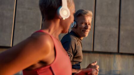 Ideal running partner. Portrait of happy and healthy middle-aged couple in headphones running together through the city street and smiling