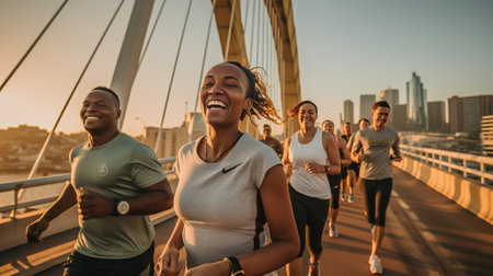 Full length of young people in sports clothing jogging while exercising on the bridge outdoors : Generative AI