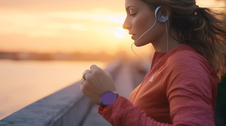 Horizontal shot of sporty woman looks at smartwatch screen checks results of fitness training how much calories she burned listens music via headphones dressed in casual : Generative AI