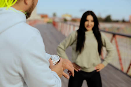 Young woman looking at her boyfriend and smiling during their jogging in the city