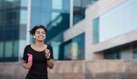 African woman staying active and healthy, joyfully running and jogging for fitness and wellness