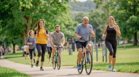 Group of diverse people jogging and cycling outdoors in park, enjoying active lifestyle, fitness, and well-being while surrounded by nature on sunny day