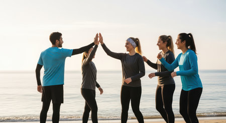 A group of four fit athletic people jogs towards the camera on a wooden pier at sunset, with a city skyline in the distance. They are smiling and wearing sportswear, embodying an active and healthy lifestyle. The warm glow of the setting sun creates an energetic and motivating atmosphere for fitness.