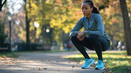 A runner on a park trail crouching down to hold her knee after experiencing sharp pain