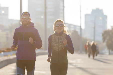Runners fitness couple running in the city park. Active couple jogging outdor in the morning
