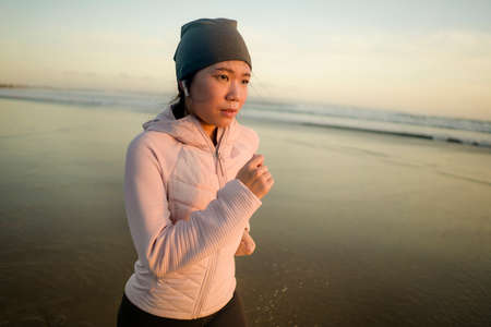 Asian girl running on the beach - young attractive and happy Chinese woman doing jogging workout at beautiful beach enjoying fitness and healthy runner lifestyle