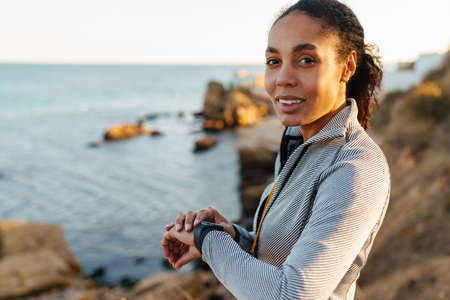 Smiling african american sportswoman looking at smartwatch while standing at beach