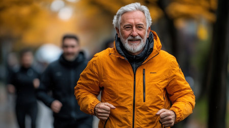 An older man is joyfully jogging in a park filled with autumn foliage.
