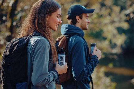 A young couple smiles as they hike along a riverbank, enjoying nature and staying hydrated with water bottles.