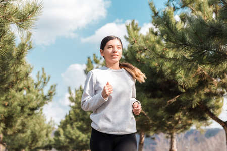 healthy lifestyle. cheerful attractive woman running in park with pine trees in the morning