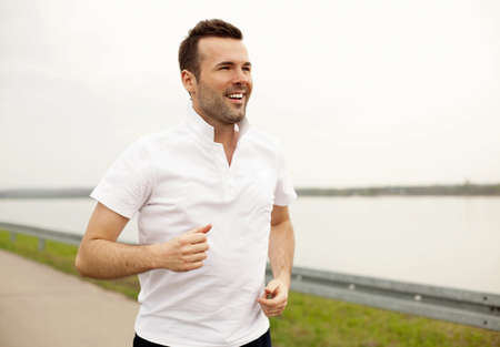 Motivated couple of runners out for a run on the lake at the sunrise. Young man and woman in sport clothing, running together. Sportive people training outdoors