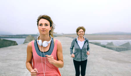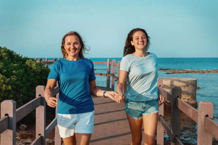 Happy mother and daughter running on sidewalk by the sea. Smiling middle-aged woman and teenage girl holding hands and walking at sunset, three quarter length shot. T-shirt mockup