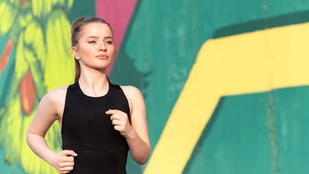 Young blonde woman in sportswear running on the road at outdoors training, multicolored wall on the background