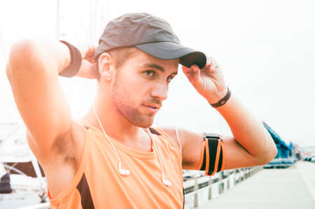 A healthy teenage boy resting on a bridge after jogging in the morning. Young man exercising outdoors.